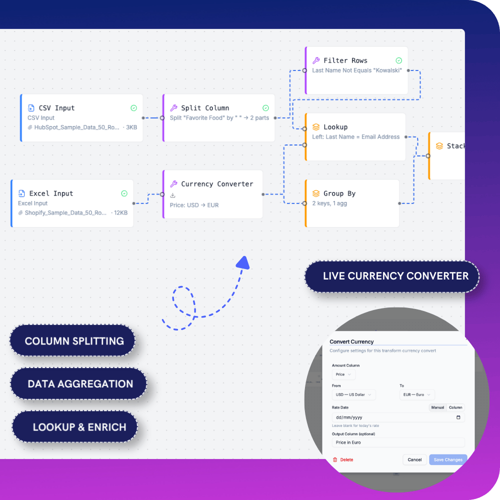 Add fields, merge data from other files, or run advanced transformations. Set up your workflow once, then reuse it forever with a single click.