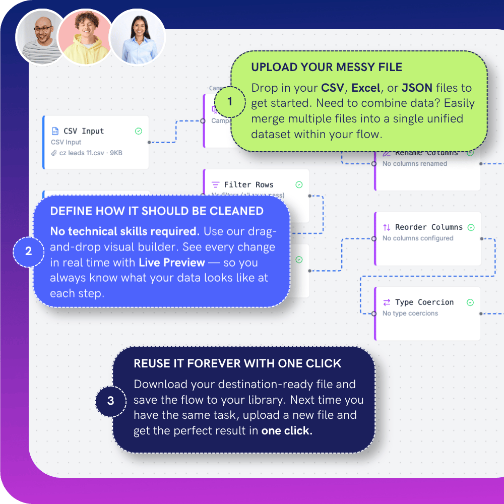 Clean and format your file once. Then reuse the same transformation forever for reports, uploads, and recurring workflows.