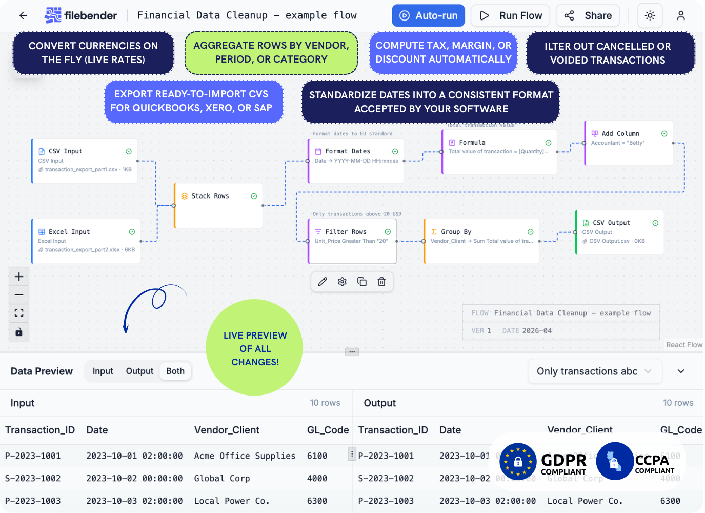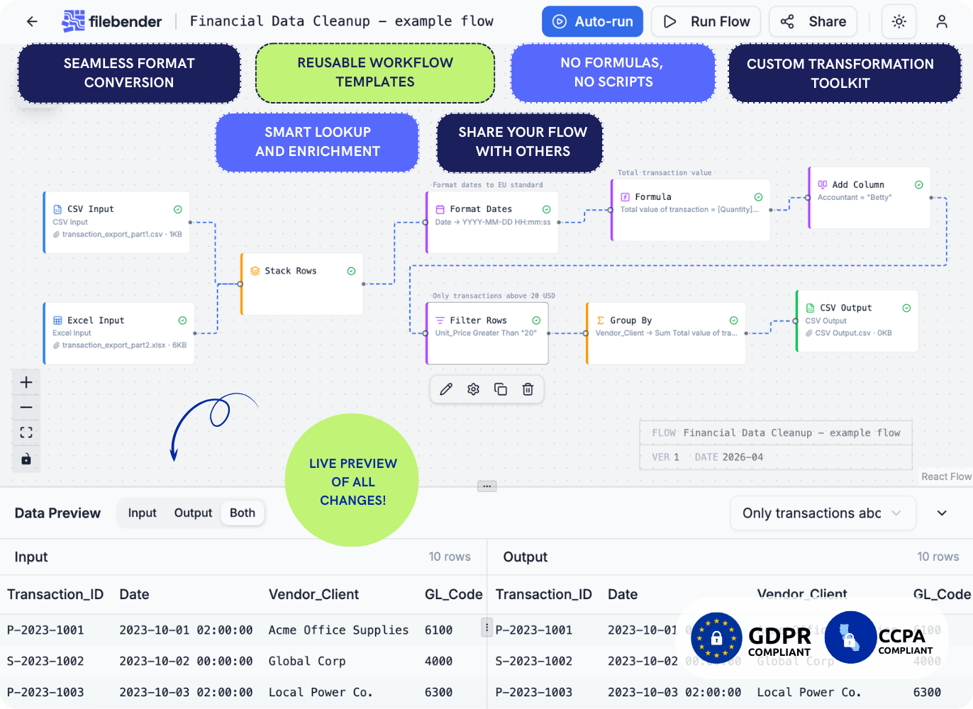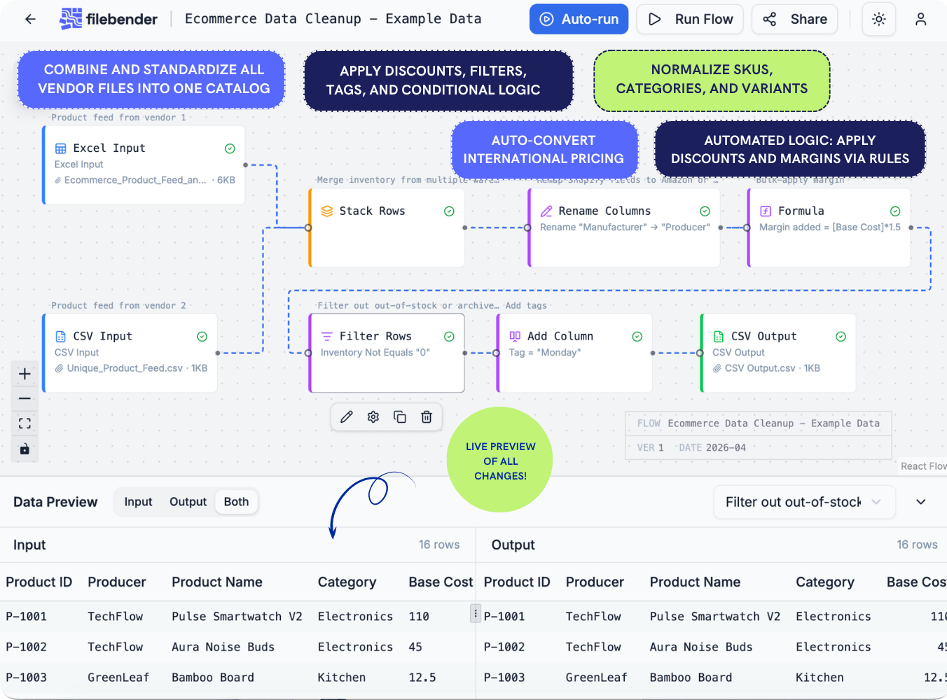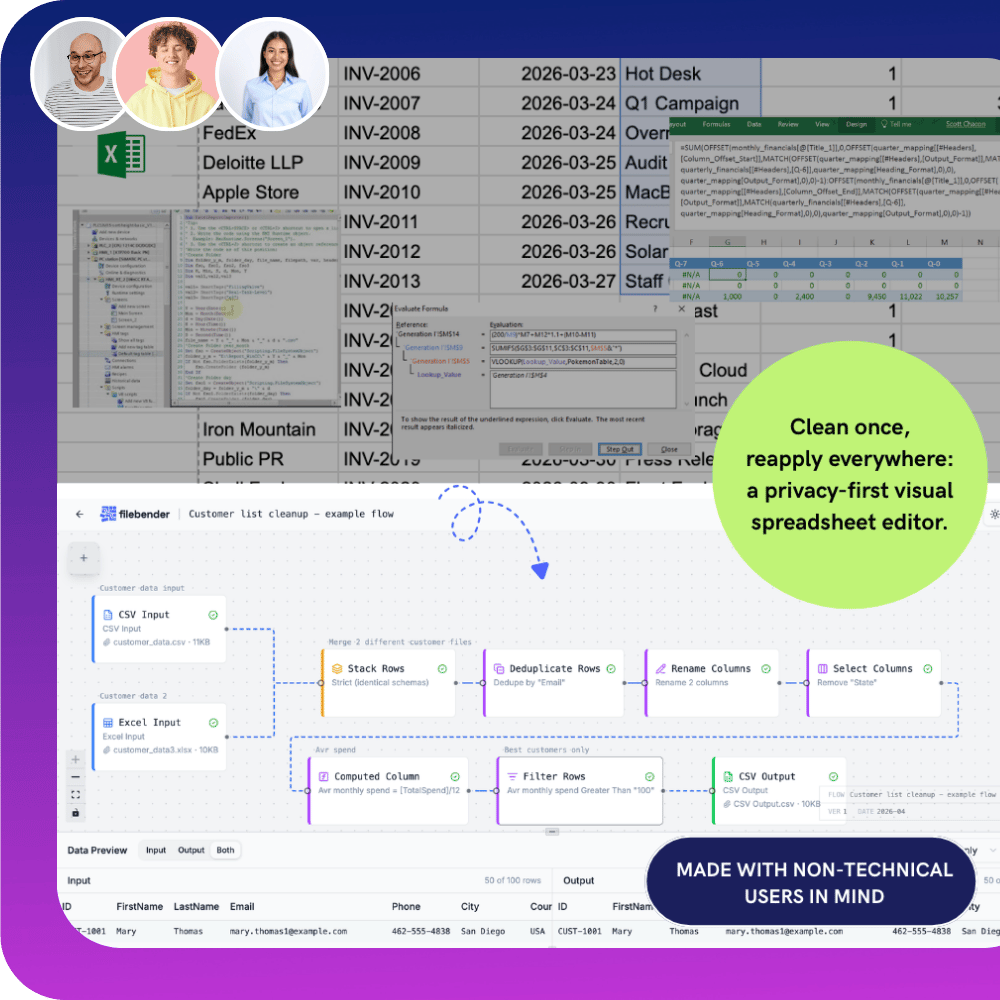 In Excel, you repeat the work every time. In FileBender, you build a flow once, then simply drop in new files and get them transformed in seconds.
