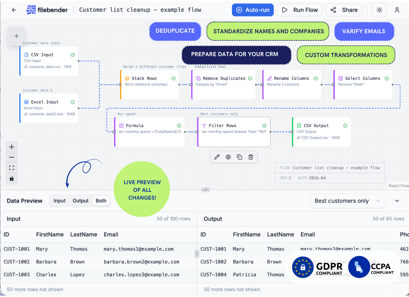 Challenge our team →FileBender turns messy CSV, Excel, or JSON files into perfectly formatted outputs for your tools — without the weekly cleanup ritual.